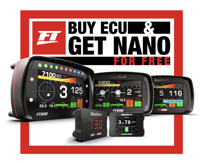 The offer is available in three “packs,” each of which offers slightly different benefits, so you can find the performance that’s right for you. For example, the FT600 ECU includes a free NanoPRO Wideband O2 Sensor Controller, their three-in-one interface that acts as a secondary dash, an O2 conditioner, and a switch panel, all while measuring less than three inches. By bundling it with the FT600, you’re guaranteed FuelTech’s most advanced engine control/monitor system, with a user-friendly interface and an impressive list of features.