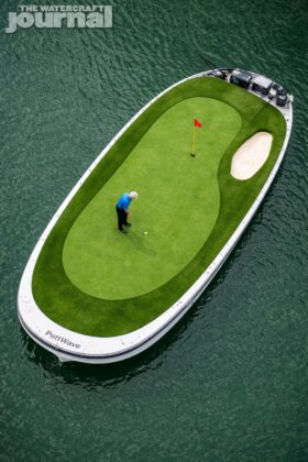 Riding on a 32-foot-long by 16-foot-wide NanoXcel hull, the PuttWave is powered by Yamaha’s naturally-aspirated 1.9-liter 4-cylinder four-stroke producing 200-horsepower on pump-gas 87 octane.
