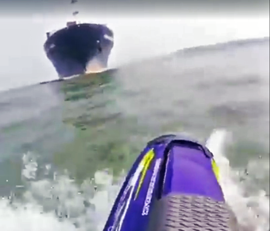 The who, when and where are unknown nor do they truly matter. What matters is that a foolhardy rider aboard a SuperJet dares to venture not mere too close, but close enough to attempt to graze their hand along the hull of the container ship. Of course, the massive displacement (an estimated 10,800 tons given that it appears to be fully laden) is enough to churn a wake so ferociously that the rider almost immediately loses balance and falls off.